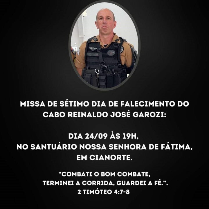 Está marcada para ter início às 19h deste domingo (24) a missa de sétimo dia de falecimento do Cabo Reinaldo José Garozi, Comandante da Rotam (Rondas Ostensivas Táticas Metropolitanas) que faleceu após entrar em confronto com bandidos armados no município de Cianorte, no último domingo (17). A missa acontecerá no Santuário Nossa Senhora de Fátima, em Cianorte.
