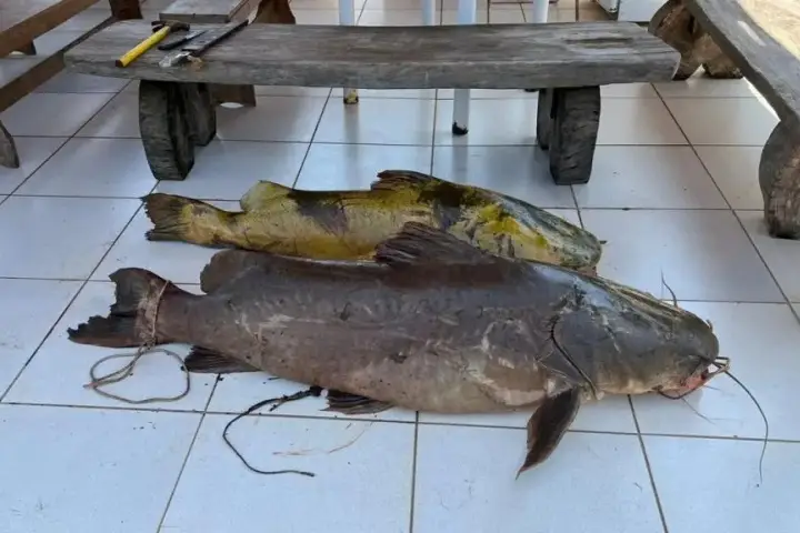 Uma abordagem foi realizada e os agentes encontraram os dois exemplares da espécie Jaú, cuja pesca é proibida desde o Salto Bananeira até a foz do Rio Paraná. O homem também informou aos policiais que não tinha carteira de pesca e havia pescado com espinhel, objeto proibido.