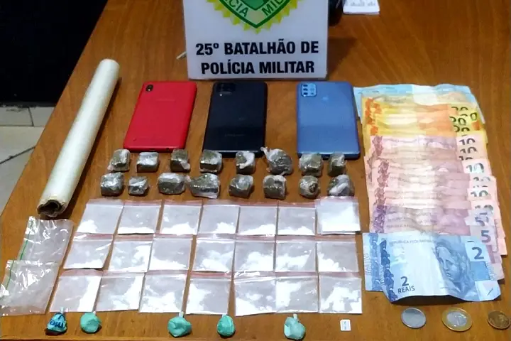 Além disso, na cozinha foi encontrado um rolo de papel filme (utilizado para embalar entorpecentes), bem como 2 embalagens pequenas com características usadas para o mesmo fim. No local, também foram apreendidos 3 celulares e a quantia de R$ 547 em dinheiro.