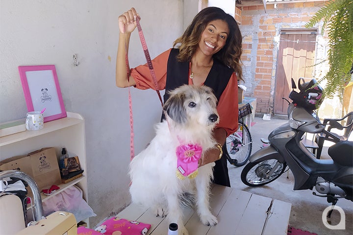 Camila diz que nem sempre as roupas prontas que o mercado oferece servem para todos: “Meus clientes são, muitas vezes, os cães muito grandes e os muito pequenos, então faço sob medida… Com minha fita métrica, eu vou à casa do cliente para tirar as medidas do pet e, em casa, corto e costuro as peças”, explica a moça, que é formada em Pedagogia e trabalha em uma escola.