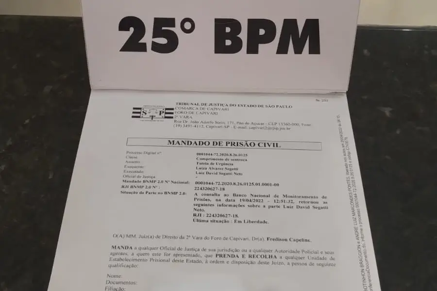 Segundo a PM, o homem foi localizado na entrada de uma empresa da cidade. Em abordagem, foi constatado o mandado de prisão civil emitido pelo Tribunal de Justiça do Estado de São Paulo, através da Comarca de Capivari.