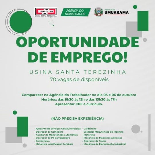 A Usina Santa Terezinha irá realizar um mutirão de entrevistas de emprego para preenchimento de 70 vagas de emprego disponíveis para os mais variados cargos. O evento acontecerá nos dias 5 e 6 de outubro na Agência do Trabalhador de Umuarama.