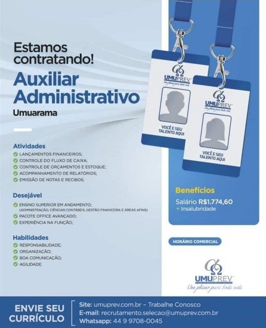 A Umuprev também divulgou que está com uma vaga disponível para o cargo de Auxiliar Administrativo em Umuarama. É desejável que o candidato esteja cursando ensino superior em administração, gestão financeira, contábeis ou áreas afins, possua experiência na função e pacote Office avançado.