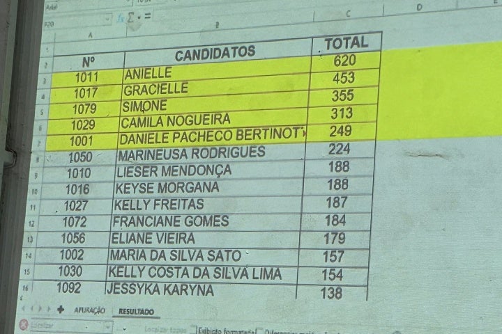 Os cinco titulares eleitos, com as respetivas votações, foram: Anielle Aparecida de Almeida Oliveira, que obteve 620 votos; Gracielle Ernesto da Costa Lira, 453 votos; Simone Cristina Dalloca Martins, 355 votos; Camila Mara Nogueira Rossoni, 313 votos; e Danielle Pacheco Bertinotti de Alvarenga, eleita com 249 votos.