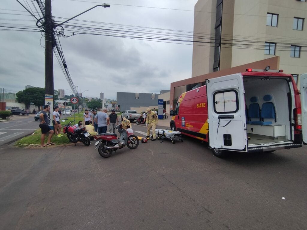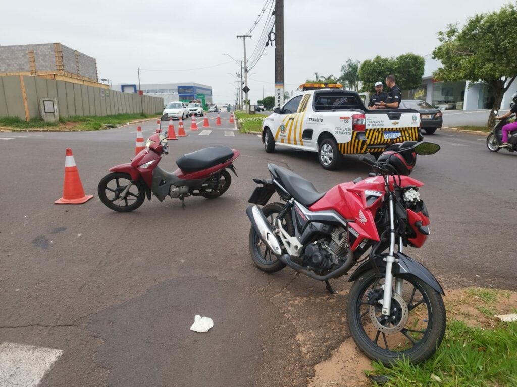 Dois condutores, de 27 e 39 anos, ficaram feridos em um acidente envolvendo duas motocicletas na tarde desta quinta-feira (5) em Umuarama, na Avenida Paraná, nas proximidades do Lago Aratimbó. O choque aconteceu quando o condutor da Titan seguia pela Avenida Paraná em direção ao centro, e a Honda Biz acessava a Rua Leonildo Stecca, no sentido do Jardim Cruzeiro.
