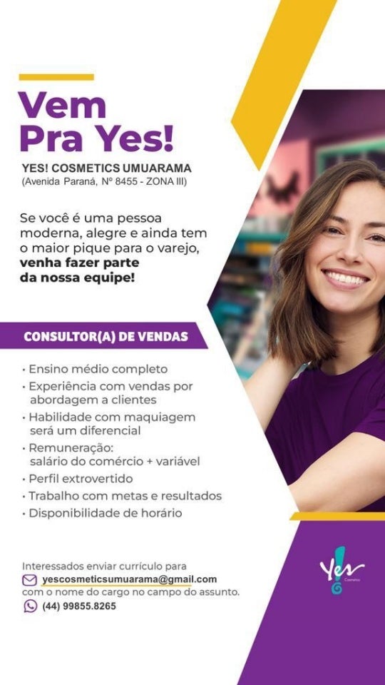 Interessados devem enviar currículo para o e-mail yescosmeticsumuarama@gmail.com especificando o cargo no título. Mais informações pelo telefone (44) 99855-8265.
