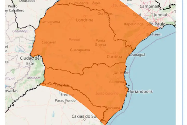 O Instituto Nacional de Meteorologia (Inmet) emitiu um novo aviso laranja de tempestade abrangendo todo o estado do Paraná, incluindo Umuarama, Santa Catarina e parte do Rio Grande do Sul. A vigência deste alerta tem início à 0h01 deste sábado (7) e se estenderá até às 23h59 de domingo (8)