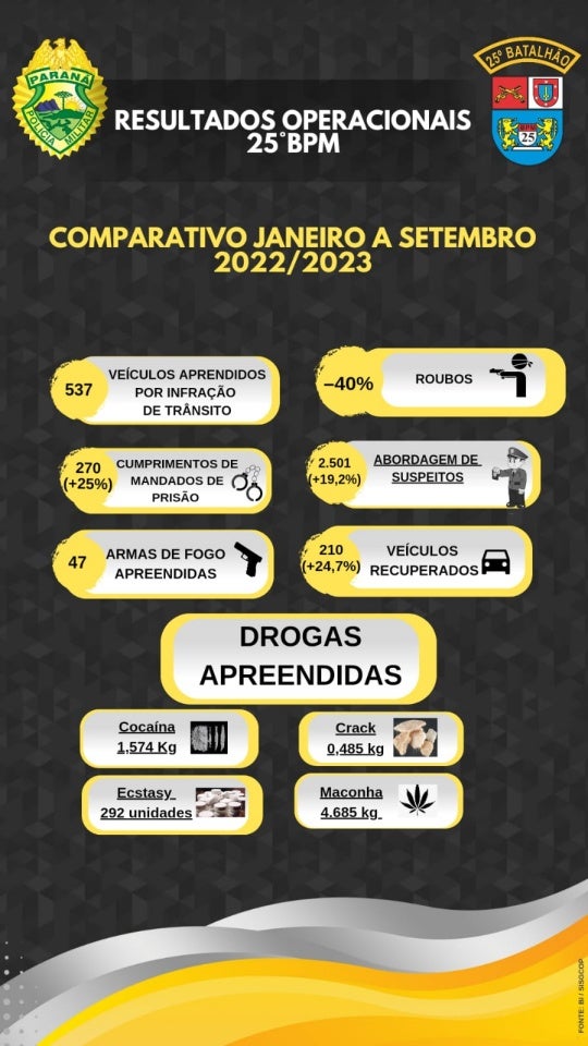 O 25º Batalhão de Polícia Militar (BPM) divulgou, nesta sexta-feira (6), o resultado da análise estatística e criminal dos municípios da área de competência da unidade – que tem sede em Umuarama – no período de janeiro a setembro de 2023. Os dados revelam um aumento considerável nas apreensões de veículos e queda nos índices de roubo, quando comparados com o mesmo período em 2022.