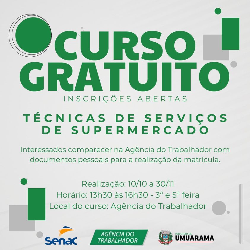 Estão abertas as inscrições para o curso gratuito de técnicas de serviços de supermercado, em Umuarama. Os interessados devem comparecer na Agência do Trabalhador com os documentos pessoais para a realização de matrícula.