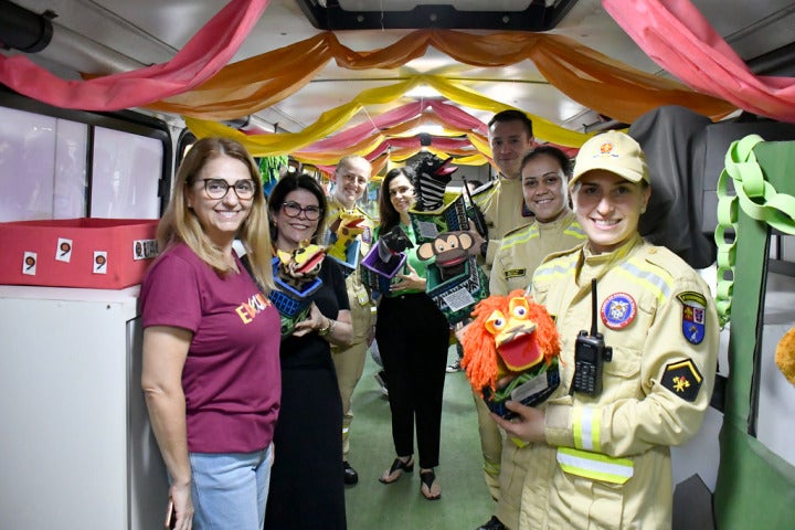 Representando o Corpo de Bombeiros, fizeram a entrega o tenente Marçal e as soldados Opalinski, Hardt e Fernanda. Também participou do ato a coordenadora geral da Secretaria Municipal de Educação, Elisângela Reis.