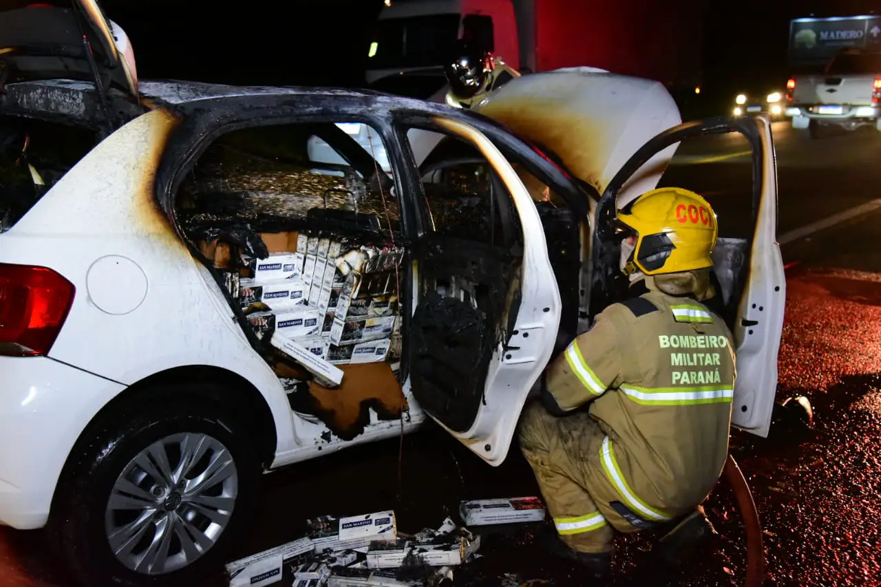 O condutor do carro carregado com cigarros fugiu. O veículo pegou fogo