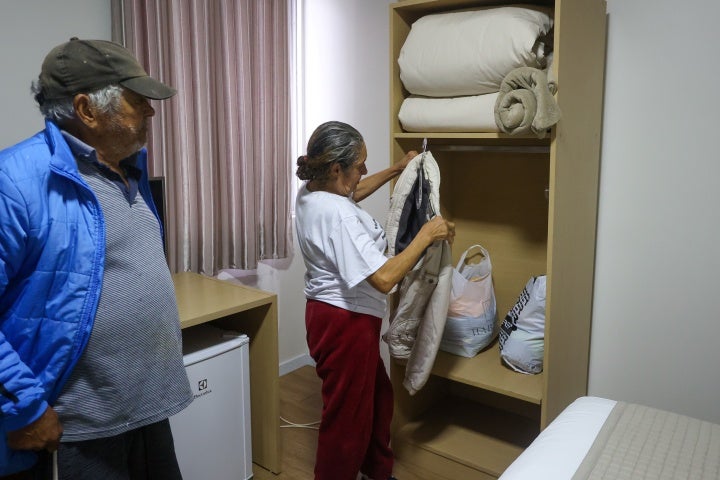 O vendedor ambulante Geraldo de Lima Oliveira, de 75 anos, e a esposa Joventina Francisca dos Santos, 59, foram os primeiros a irem para um hotel em São Mateus do Sul. Apesar da situação delicada e da vontade de voltar para a casa, que precisou ser evacuada devido à inundação, eles demonstram tranquilidade por estarem em um local confortável.