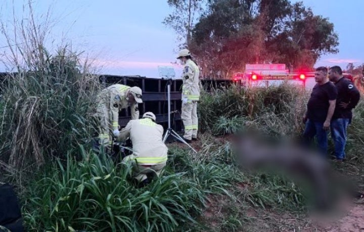 O automóvel foi esmagado pelo veículo de carga e até o momento não foi possível identificar qual seu modelo (a princípio um Gol). As primeiras informações sobre a vítima apontam que é um homem e que está usando chapéu.