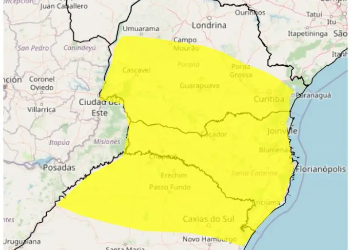 O Instituto Nacional de Meteorologia (Inmet) divulgou um aviso de tempestade para partes do Paraná e Rio Grande do Sul e todo o estado de Santa Catarina. O alerta entrou em vigor às 14h50 desta segunda-feira (23) e segue em vigência até às 10h de terça (24).