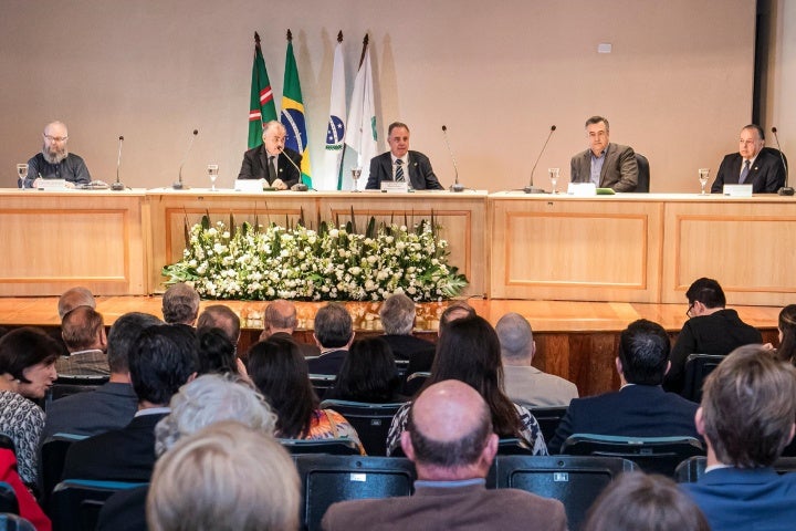A mesa diretora da solenidade foi composta pelo presidente do CRM-PR, Romualdo José Ribeiro Gama; pelo secretário estadual da Saúde, Carlos Alberto Gebrim Preto, representando o governador Carlos Massa Ratinho Junior; pelo titular honorário da Academia Paranaense de Medicina, Prof. Dr. Gastão Pereira Cordeiro Filho, representando a presidência; pelo conselheiro federal do CFM, Donizetti Dimer Giamberardino Filho, representando o presidente José Hiran da Silva Gallo; e pelo vice-presidente do Sindicato dos Médicos do Paraná, Darley Rugeri Wollmann Junior.