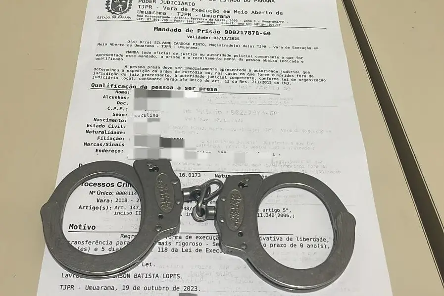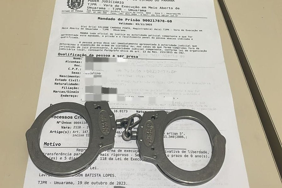 Em checagem pelo nome, foi constatado que havia um mandado de prisão expedido pela Vara de Execução em Meio Aberto de Umuarama, pelo crime de ameaça. O homem recebeu voz de prisão e foi encaminhado para a Delegacia de Polícia Civil de Umuarama.