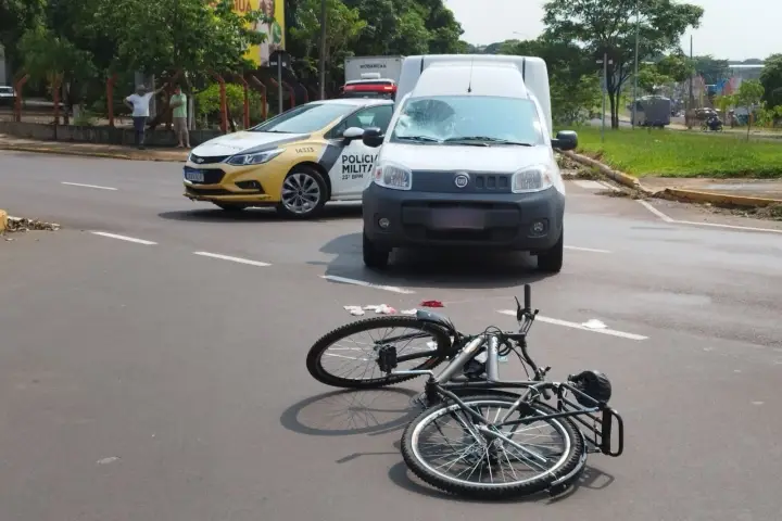 Um ciclista, de 54 anos, sofreu um ferimento grande na região da cabeça após ser atingido pelo condutor de um Fiat Fiorino, de 22 anos, na manhã desta quinta-feira (26), no cruzamento das avenidas Governador Parigot de Souza com Guanabara, no Parque Danielle, em Umuarama.