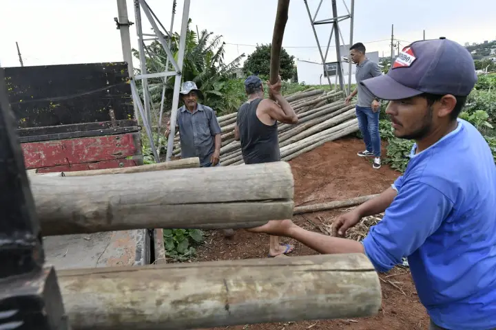 A Secretaria Municipal de Agricultura distribuiu recentemente cerca de 300 palanques de eucalipto tratado para a cobertura da horta com tela de sombreamento, um material que ajuda a regular a exposição das plantas ao sol.