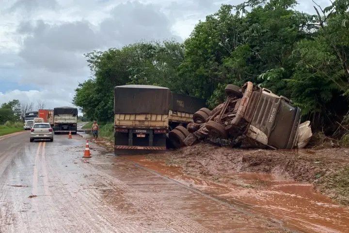 A Polícia Rodoviária Estadual (PRE) atendeu a ocorrência por volta das 10h15. O caminhoneiro afirmou que seguia com o veículo acoplado a dois semirreboques no sentido Alto Piquiri à Brasilândia, quando, no quilômetro 111 mais 800 metros aquaplanou devido à água e lama na pista.