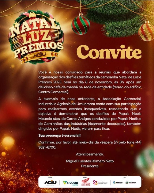 A Associação Comercial, Industrial e Agrícola de Umuarama (Aciu) anunciou a realização de uma reunião agendada para esta quarta-feira (8) às 8h, que terá como pauta a organização dos desfiles temáticos da campanha Natal de Luz e Prêmios 2023. O convite é estendido a todos os empresários da cidade interessados em participar dos desfiles de Papais Noéis.