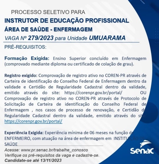 O Senac de Umuarama divulgou que está com uma vaga aberta para Instrutor de Educação Profissional na área da Saúde. Os pré-requisitos são Ensino Superior concluído em Enfermagem. Confira os detalhes abaixo: