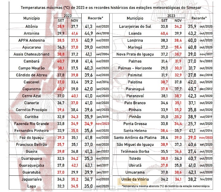 Em Curitiba e região metropolitana fez quase 35°C, já entre as faixas norte e oeste do Estado quase chegou aos 40°C. Mas no Litoral ficou ainda mais quente, fez 41°C em Antonina. Na tabela no fim da matéria é possível conferir mais informações sobre as duas mais fortes ondas de calor de 2023: do fim de setembro e a deste início de novembro.