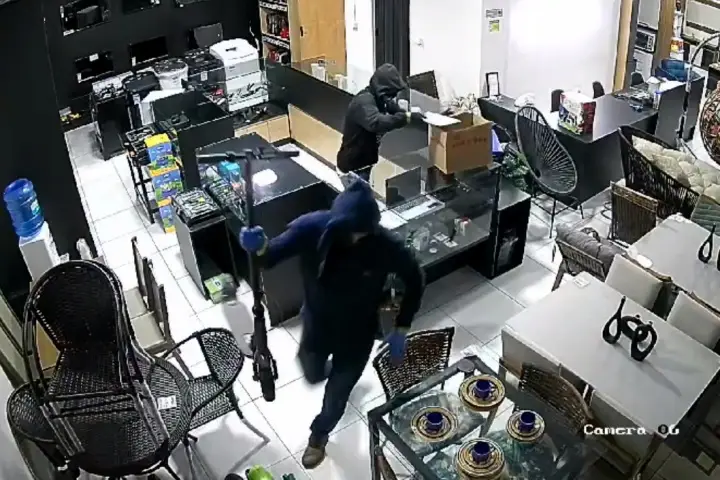 Na filmagem, é possível ver que os invasores estão com os rostos cobertos por toucas – possivelmente por saberem que seriam filmados no local – enquanto um deles coloca alguns eletrônicos dentro de uma caixa enquanto o outro se encarrega de pegar um patinete e o dinheiro que estava na caixa registradora.
