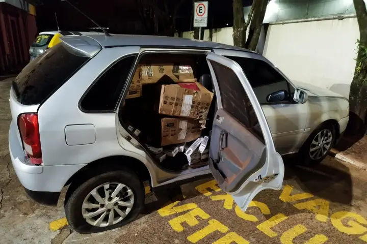 A Polícia Militar (PM) apreendeu um VW Gol carregado com quinze caixas de cigarros paraguaios na madrugada desta quinta-feira (16), no Parque Bonfim, em Umuarama. De acordo com a corporação, o condutor do veículo ignorou a ordem de parada e fugiu em altíssima velocidade, posteriormente abandonando o veículo e fugindo a pé dos policiais.