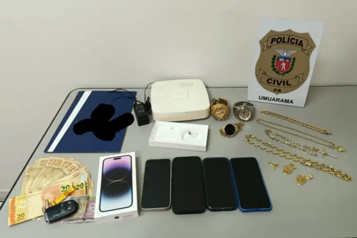 De posse dos mandados, os agentes da Polícia Civil de Umuarama foram até a residência do suspeito e o encontraram no local. Em seguida, realizaram busca na residência e realizaram a apreensão de um veículo Jeep Compass, quatro aparelhos celulares, R$ 1.974,00 em espécie, quatro mil guaranis (moeda estrangeira), joias, um aparelho DVR, vários documentos pessoais falsificados, além de outros documentos de interesse para as investigações.