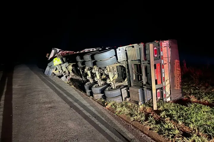 Um caminhã Scania/G360, com placa de Marau (RS), tombou na tarde desta quinta-feira (16) na PR-486, no sentido de Perobal para Alto Piquiri. Segundo informações da Polícia Rodoviária Estadual (PRE), o acidente ocorreu no KM 118 da rodovia.