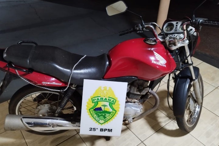 A Polícia Militar (PM) apreendeu, na noite deste sábado (18), uma motocicleta que estava com a placa trocada e a numeração do chassi raspada, no distrito de Nova Santa Helena, em Iporã. De acordo com testemunhas no local, o veículo foi deixado em via pública por um homem até o momento não identificado.