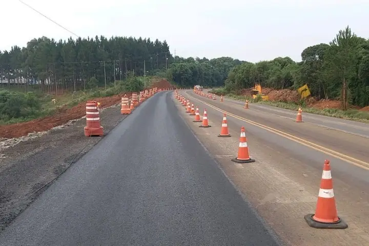 PRC-466 em União da Vitória – Trecho com operação pare-e-siga das 7h às 20h, com bloqueio total somente à noite, devido ao risco de escorregamento de rochas sobre o pavimento.