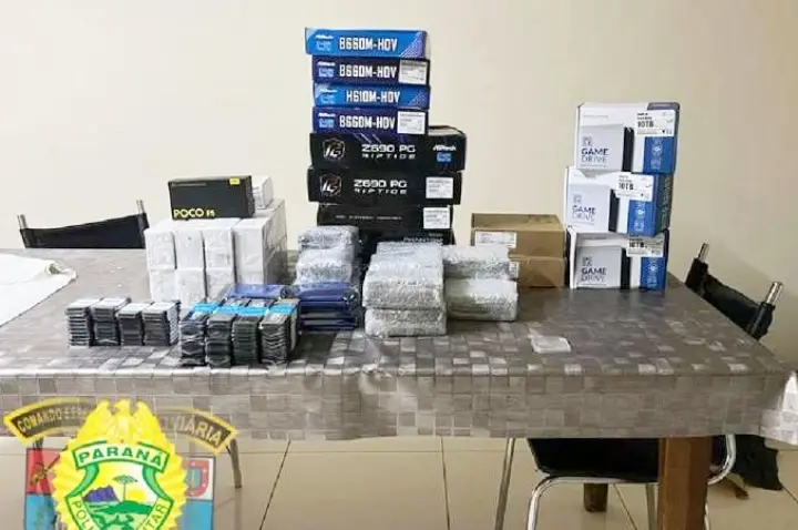 A PRE (Polícia Rodoviária Estadual) apreendeu 19 celulares e diversas peças para computadores em um ônibus na PR-986, na cidade de Rolândia. O veículo fazia a linha Umuarama a São Paulo e os policiais encontraram os objetos em uma abordagem.