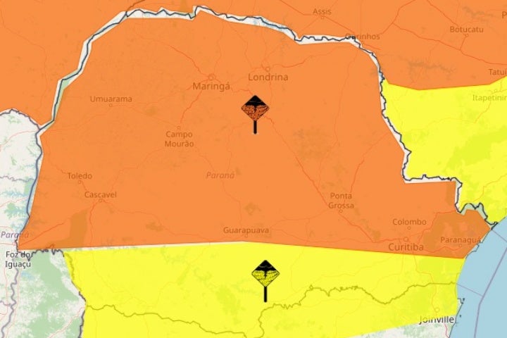 O Inmet (Instituto Nacional de Meteorologia) publicou um alerta laranja – com grau de severidade moderado – para ocorrência de temporais na região Noroeste do Paraná, que compreende Umuarama e municípios próximos. O alerta entrou em vigência às 12h e é válido até as 23h59 desta quinta-feira (23).