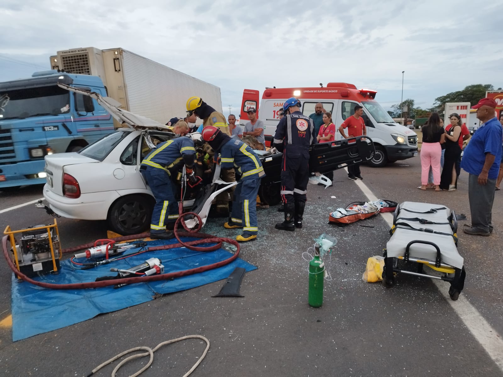 O acidente ocorreu em frente ao posto de combustíveis Mahle. A rodovia está interditada, mas o tráfego está fluindo pelo acostamento e pelo pátio do posto de combustíveis. Os condutores devem ter atenção no trecho.