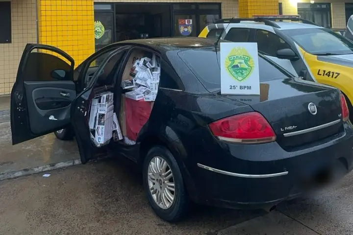 Em revista no carro, foi constatado que ele estava carregado com 30 caixas de cigarros da marca Palermo, de origem Paraguaia.