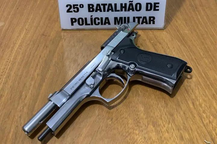 No local, os policiais avistaram o suspeito e, em revista pessoal, não encontraram nada com ele. Entretanto, em um lugar próximo e com pouca iluminação, eles encontraram o simulacro de pistola da marca Pietro Beretta, calibre 177 4.7 mm.