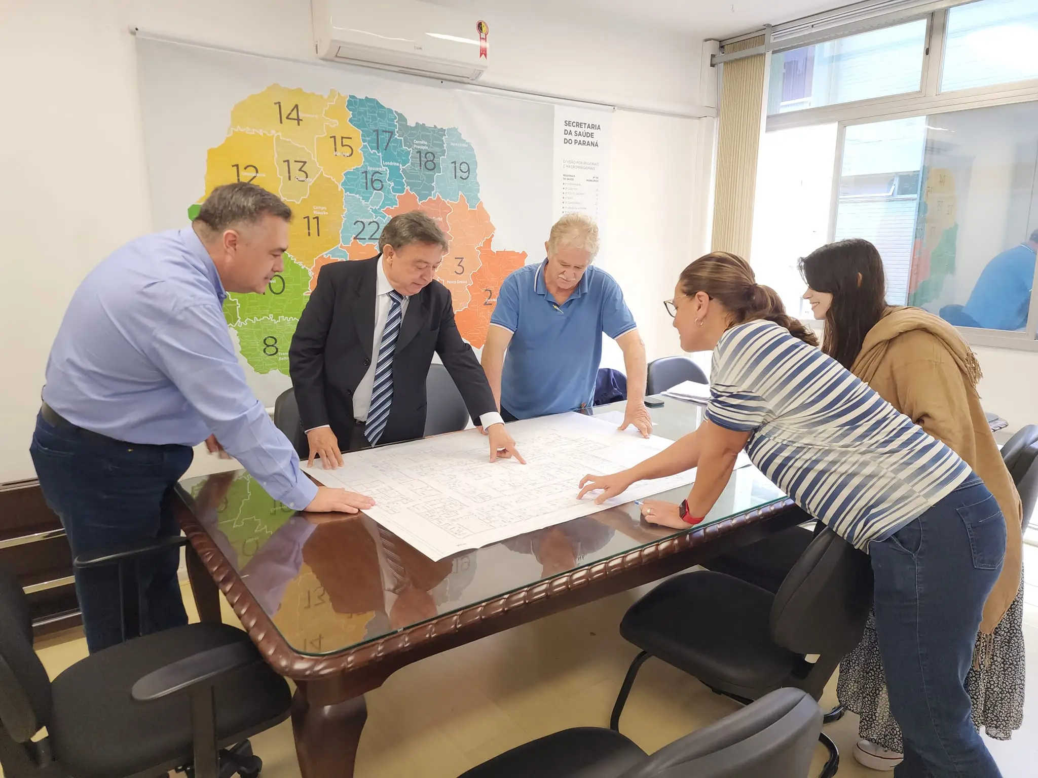 Na reunião com o secretário Beto Preto também estavam presentes a arquiteta Wanessa Fagundes, que fez a análise pela aprovação do projeto de reforma; Doutora Isabela, chefe do Departamento de Vigilância Sanitária; e o engenheiro Freitas.