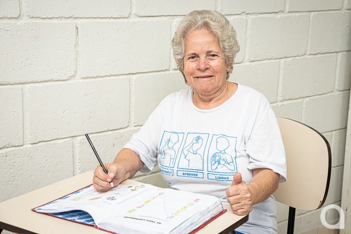 70 anos de idade tem Aparecida Genovefa, aluna do EJA da Assumu desde 2014. Até então, nunca saia de casa, porque não conseguia se comunicar. Mora distante sete quilômetros, mas nunca falta às aulas e nem às atividades extraclasses. Diz que ama a escola porque “todos a entendem”.