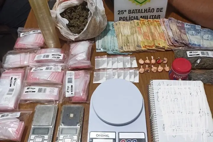 Assim, as equipes policiais entraram na casa, abordaram o proprietário e revistaram o local. Na residência, os PMs localizaram 314 gramas de maconha, 18 gramas de cocaína, R$ 7.374 em dinheiro, 3 balanças de precisão, 1 caderno de anotação e diversas embalagens.