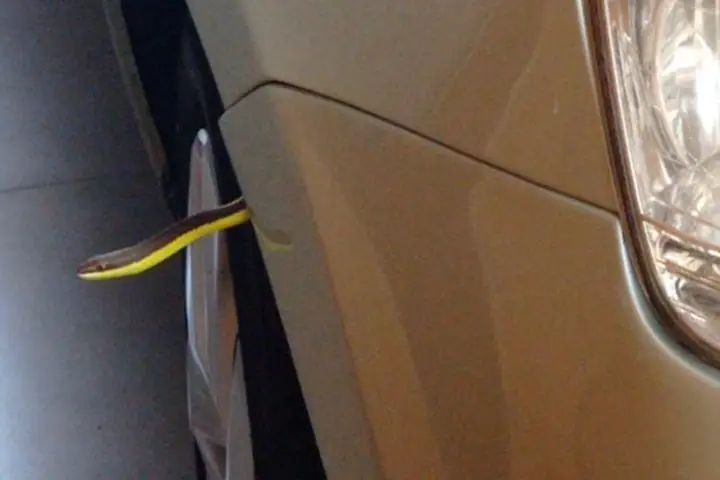 A cobra, identificada como chironius bicarinatus – mais conhecida popularmente como cobra-cipó-verde -, foi avistada no pneu de um veículo na garagem da residência.