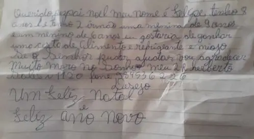 Conforme a mãe, a cartinha foi escrita pelo filho do meio, Nathan Felipe Garcia de Matos. O menino estuda no 2º ano da Escola Municipal Cândido Portinari. Além dele, Daniele, que está desempregada, tem outras duas crianças, uma menina de 9 anos e um menino de 6. “Eles não passam fome, porque eu não deixo, mas passamos dificuldades. Não consigo nem comprar roupas para eles, porque o dinheiro é para comprar comida, leite, bolacha, essas coisas mais de criança”, conta.