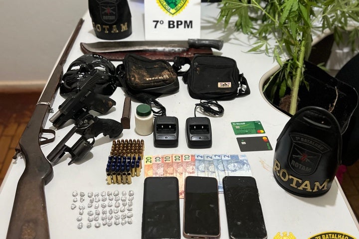Também foi apreendido uma espingarda artesanal, um revólver .38, uma pistola 9mm, munições, um simulacro de pistola, além de um pé de maconha, celulares, um facão e porções de droga.
