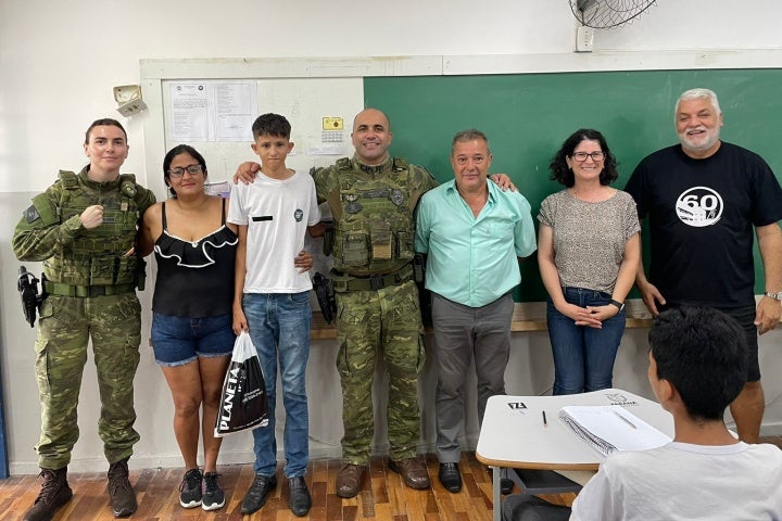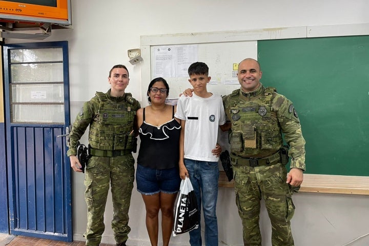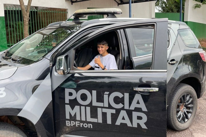 Wellington é aluno do 9º ano do colégio e esbanjou alegria e emoção ao receber as felicitações dos heróis de farda que tanto admira. A visita foi feita pela soldado Bruna Trevizani e pelo capitão Namur Zandoná, que cantaram parabéns para o rapaz e até permitiram que ele conhecesse a viatura da corporação.