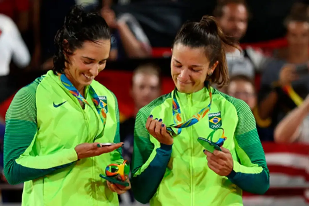 Ágatha e Bárbara com a medalha de prata no vôlei de praia nos Jogos Rio 2016. Imagem: Reprodução