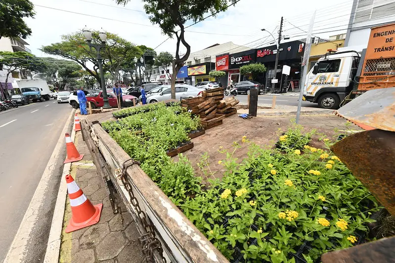 As flores darão o toque final nos canteiros, que também receberam calçamento em paver para circulação de pedestres e condutores que deixarem veículos estacionados, e a pintura das vagas dos automóveis, além de reforço na demarcação da sinalização de trânsito, num trabalho contratado pela Secretaria Municipal de Segurança, Trânsito e Mobilidade Urbana (Sestram).