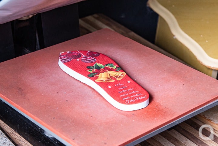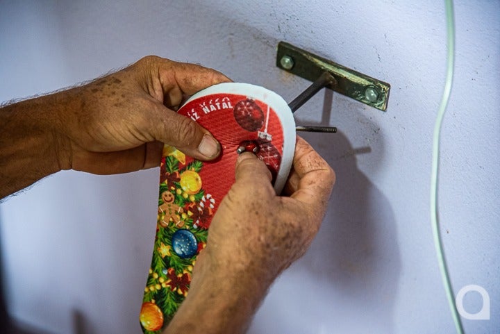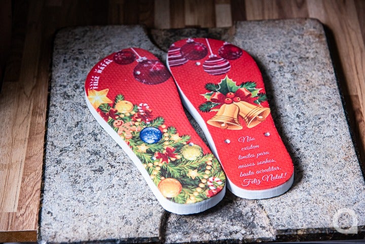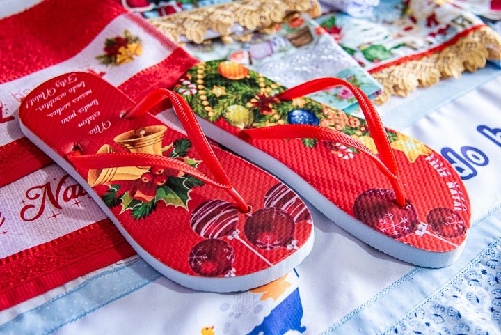 Chinelos com estampa de Natal devem aquecer as vendas do ateliê de casal de artesão