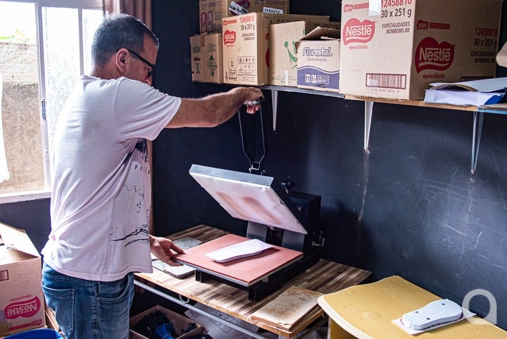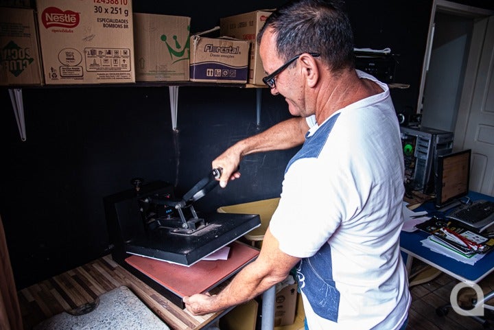 Tudo começou quando Francisco se aposentou e procurou uma alternativa de renda. Pesquisando na internet, se deparou com a arte da estamparia e se interessou. Comprou uma prensa térmica, estudou o programa de computador [onde faz as criações das gravuras que quer estampar] e foi para a ação.