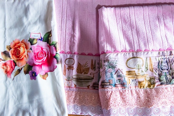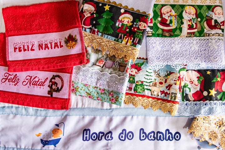 Isso deixa perceptível, a considerar o capricho que suas peças denotam. Seu trabalho, com excelente acabamento, é personalizar toalhas de banho, rosto, lavabo, de batizado e de mesa e body de bebê, entre outros itens, e decorar com fitas e rendas.