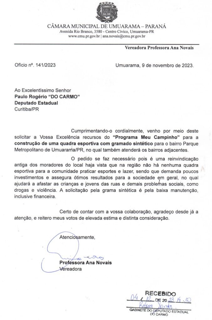 Do Carmo é tesoureiro e vice-presidente estadual do partido União Brasil. Na visita à Capital da Amizade ele também falou sobre a pré-candidatura de Ana Novais à Prefeitura de Umuarama. “A Ana é a vereadora mais votada da cidade e nos representa muito bem no União Brasil. Ela já fez alguns apontamentos para a área da saúde, para o projeto Meu Campinho. A Ana nos cobra muito e é povo como nós. Nós queremos e teremos a Ana como pré-candidata a prefeita da cidade”, disse.